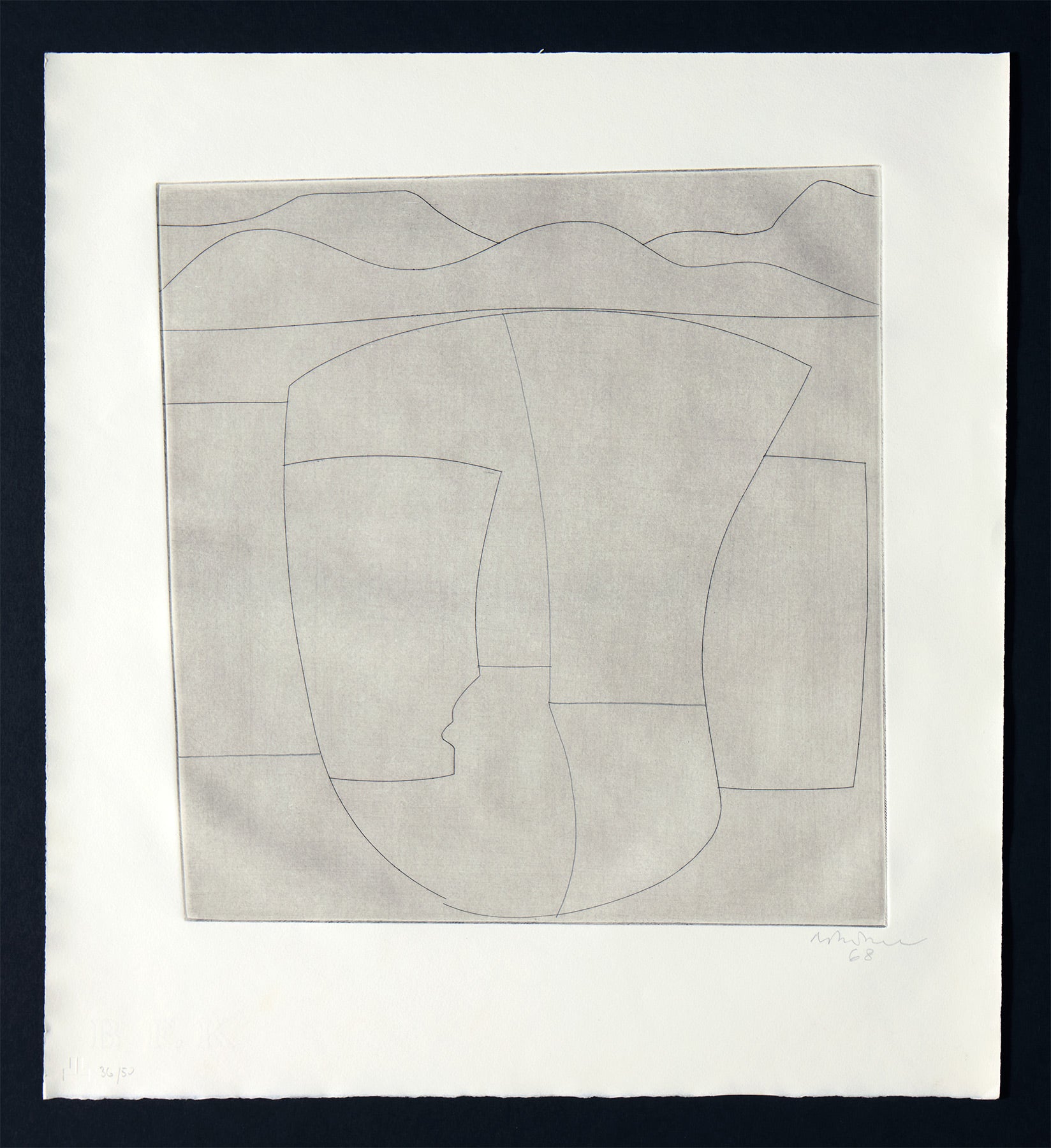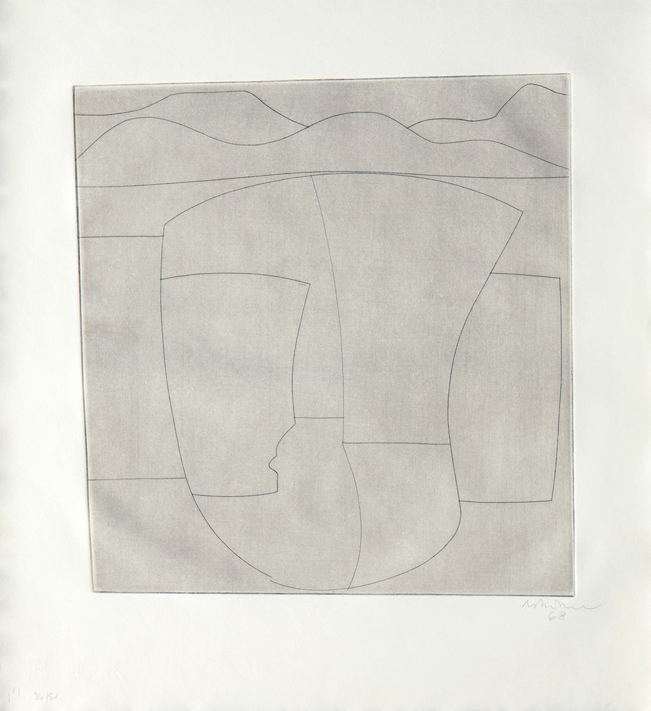 An original etching and aquatint from two plates on velin Rives wove paper from the portfolio Six Etchings (Lafranca 65, 86, 90, 97, 102 and 126 / Cristea 138-14). Signed Ben Nicholson in pencil, dated 1968 and numbered from the limited edition of 50 (there were also 6 artist's proofs). Printed by LaFranca, Locarno, Switzerland with their blindstamp lower left, and published by Editions Lafranca, Locarno. Referenced in Lafranca, 102, and Cristea, 143.