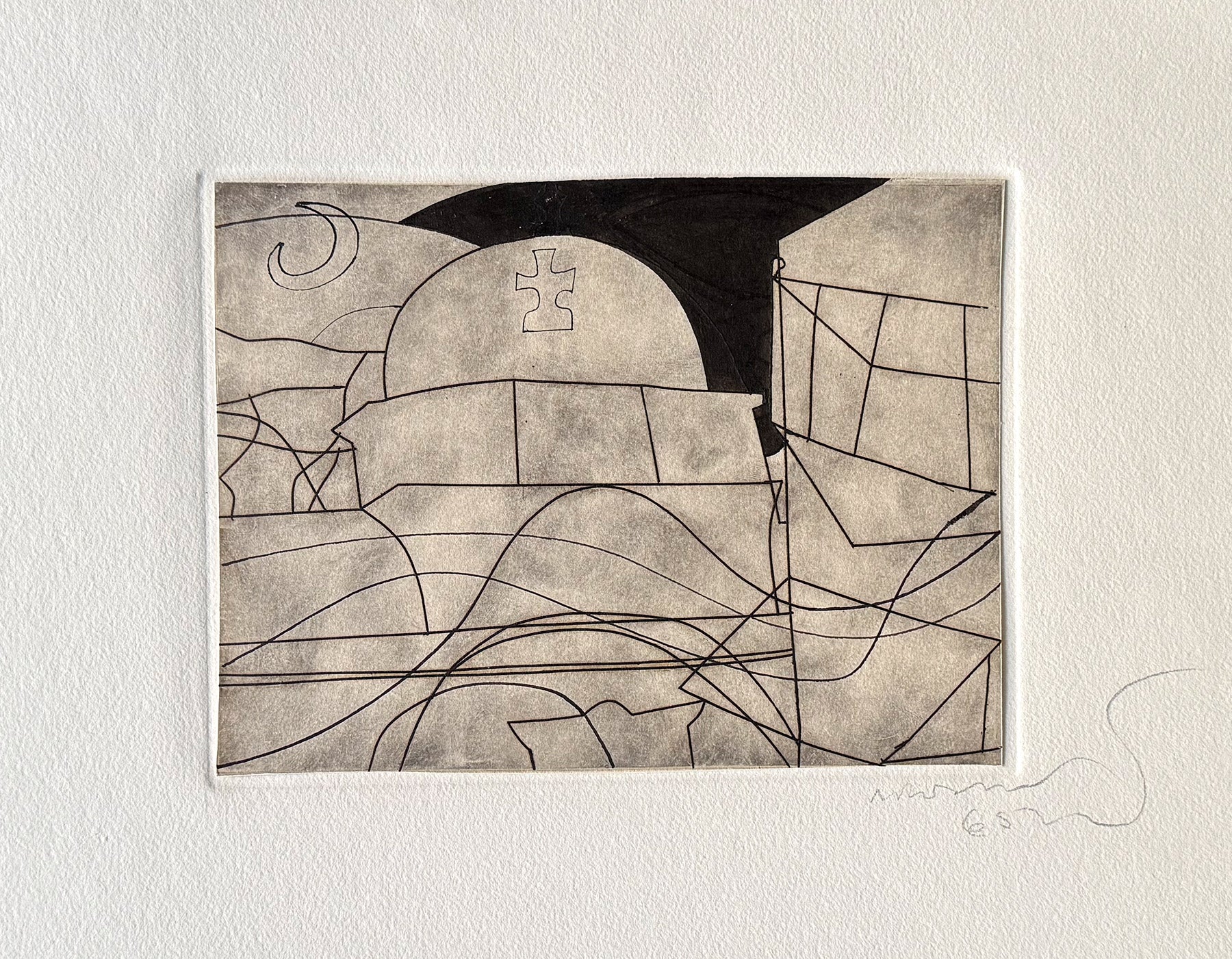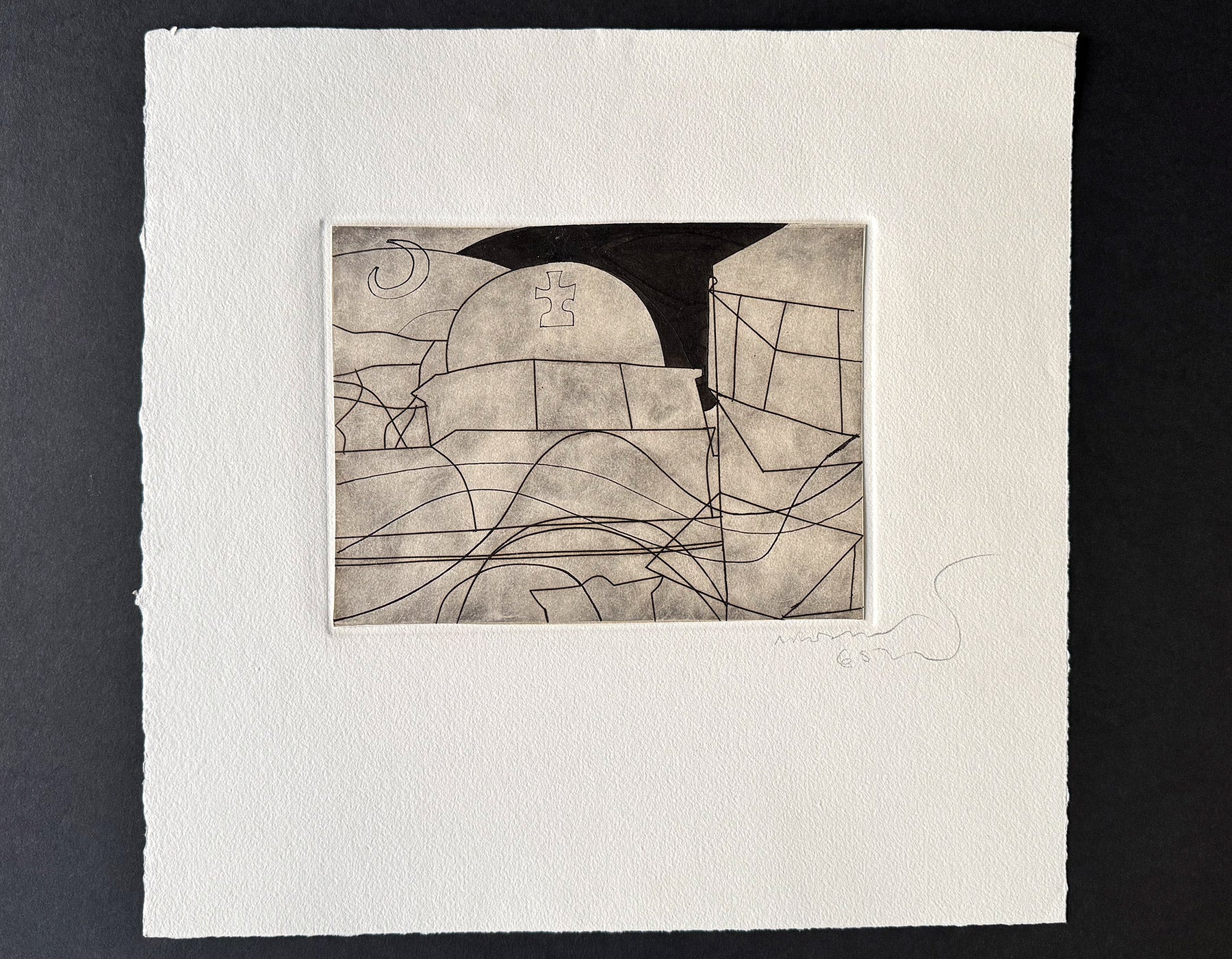 A unique, hand-coloured working proof from 1965, completed at least a year before the printed edition of Paros with Balcony (1967) from an unknown edition, later included in the portfolio Ben Nicholson 3 which was published in an edition of 50, the first 1-6 portfolios each containing a mixed media variation on a theme of Paros with Balcony. As is sometimes the case with the artist's hand-worked proofs, the printed plate has been cut from its sheet, worked on with black ink, then re-attached to the plate of a new sheet (more information below). The editing in black ink includes adding in new lines as well as blocking out etched lines with a large area of ink in the sky. The supporting sheet is signed and dated in pencil by the artist in the usual manner, and the worked plate is further signed, titled, dated and annotated in pencil on the reverse, also by the artist. Most likely printed by Francois Lafranca and M Basis and published by Ganymed Original Editions and Marlborough Fine Art, London. Referenced in Ben Nicholson Prints 1928-1968, Cristea Gallery (Rentsch Collection), AC41, the portfolio reference AC144-153. Cut plate size: 18.5cm x 24.5cm. Sheet size approx: 41.5cm x 43cm. In very good condition with only the very slightest traces of handling to the textured handmade paper, and absolutely suitable for float framing without a mount so that the entire sheet is visible (as was the artist's preference).