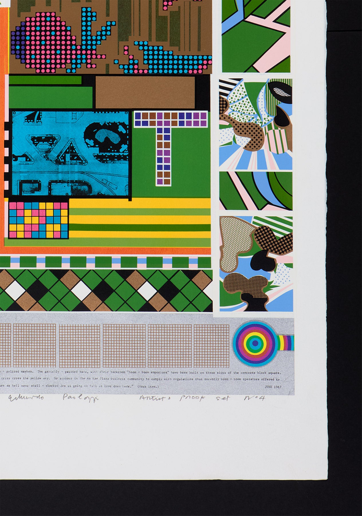 In very good/excellent fresh condition with vibrant, strong colours, very minimal marking in the silver ink lower right corner (see photos) and some very minor bumping to far sheet corners and edges. An extremely rare and beautiful early 1960s print by Eduardo Paolozzi, the father of British Pop Art, from this important folio which demonstates so well the artist's interest in the interweaving of technology and popular culture. Like many Paolozzi prints, this edition was printed in different colourways, and we particularly love this green variant.