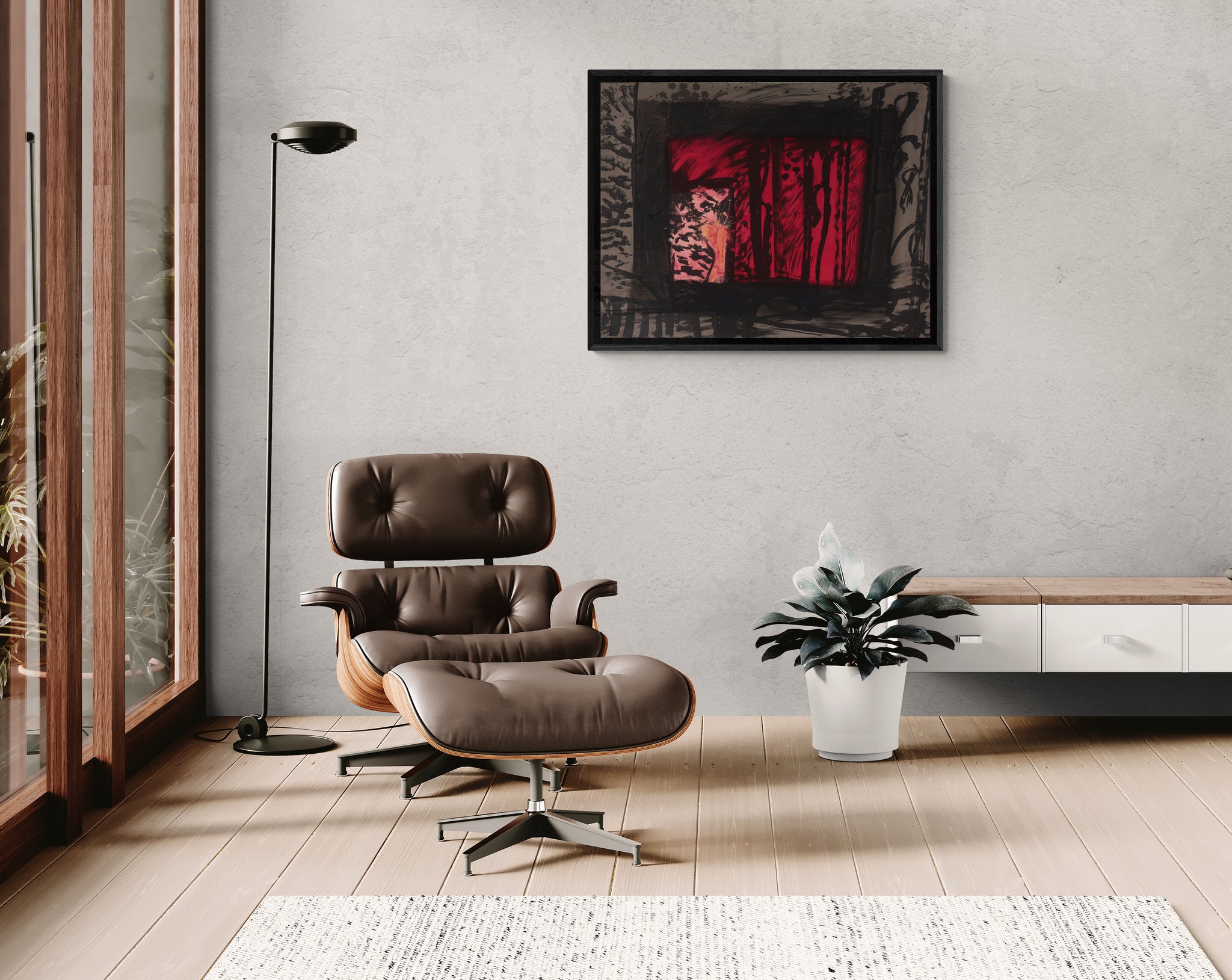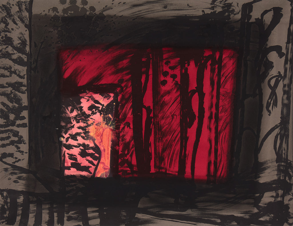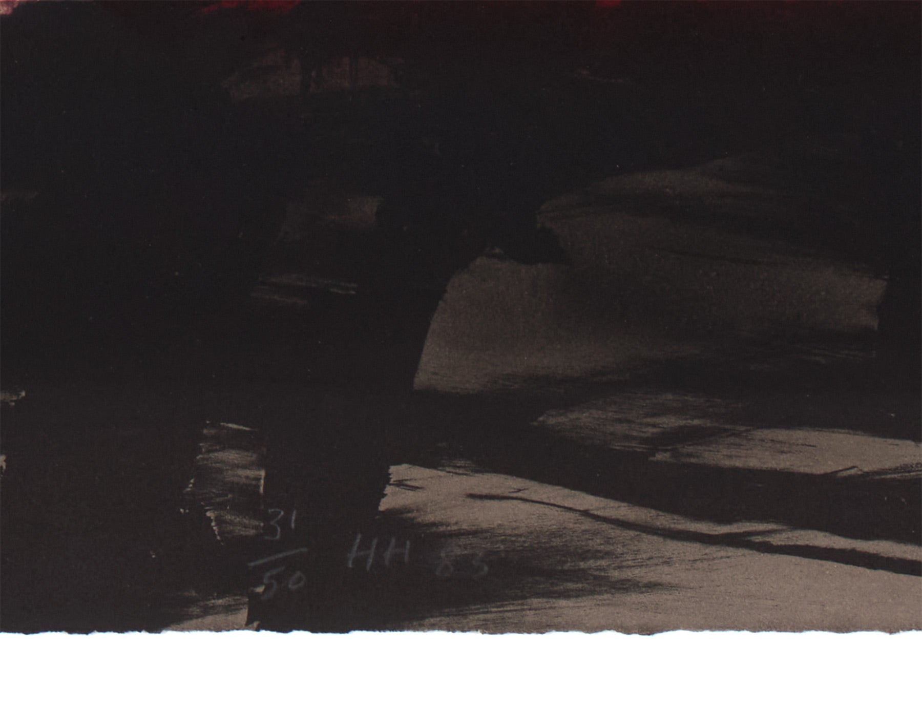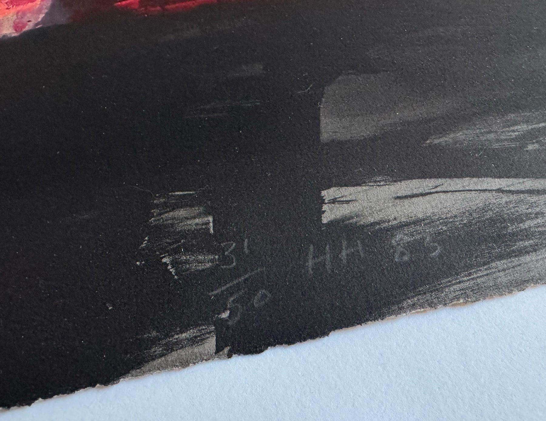 Original lithograph from three aluminium plates printed in three shades of black with hand colouring in watercolour (black wash border, pink wash ground) and gouache (a red wash ground, yellow and crimson) on buff Velin Arches mould-made 270gsm paper. Initialled HH for Howard Hodgkin in pencil, dated '83 and numbered from the small limited edition of 50. Referenced in Hodgkin's Catalogue Raisonnee by Heenk, 69. Printed at the Petersburg Studios, New York, 1983 and published by Petersburg Press, 1985.