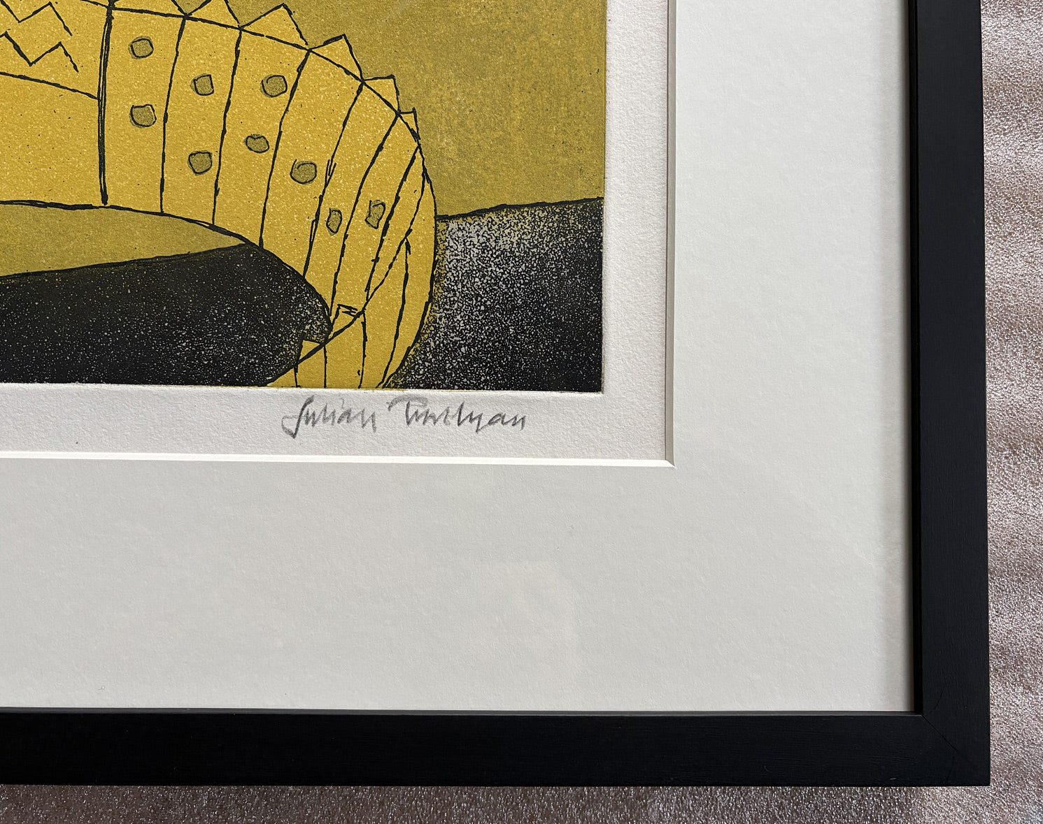 The sheet a little marked and trimmed slightly, although still with adequate margins, now beautifully reframed and ready to hang. With few sales records and rarely seen, this is a wonderful rare and gorgeously coloured Julian Trevelyan etching depicting a whimsical family of crocs.