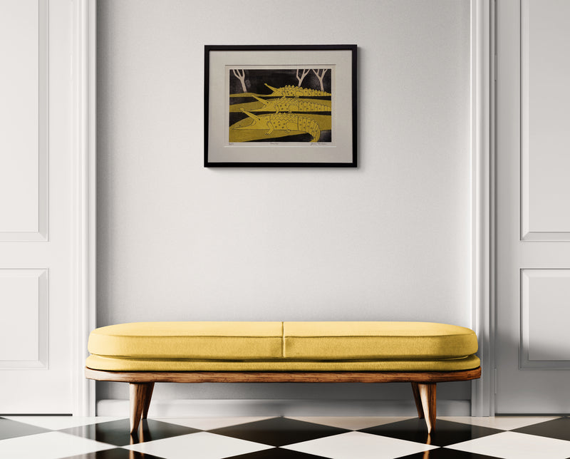 Crocodiles, an original etching and aquatint from two steel plates in 4 colours; black, grey, pink and yellow printed on Crisbrook handmade paper from the Africa Suite (1966-67). Signed Julian Trevelyan in pencil and numbered from the limited edition of 125 (there were also 14 artist's proofs. Published by Editions Alecto and printed by Michael Templar and Harry Snook (the first 20 in the edition were printed by Editions Alecto). Referenced in Turner, 189. Image size: 352mm x 475mm. Framed size: 580 x 710 x 15mm.